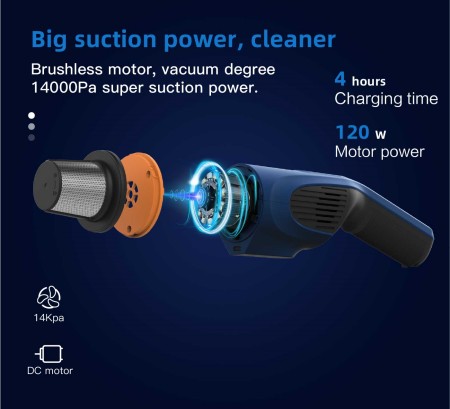 コードレス車用掃除機には、 120W高速タービンモーター機能騒音を最小限に抑えながら吸引力を強化します。その 14000paの強力な吸引技術、髪の毛、食べ物の残りカス、ペットの毛、タバコの灰、紙くず、こぼれた液体など、あらゆる種類の破片を簡単に吸収できるため、家と車の両方に理想的な掃除ツールです。