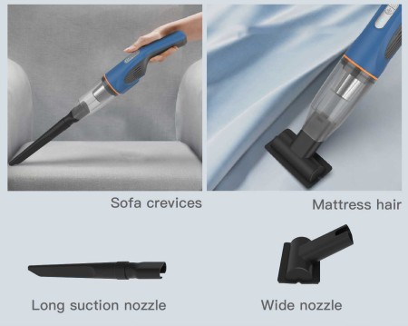 この 2-in-1 多機能コードレス ハンドヘルド掃除機には、狭くて手の届きにくいスペースの掃除に最適な 3 つのユーザーフレンドリーなアクセサリが付属しています。ブラシヘッドが含まれており、床やその他の表面の汚れ、ほこり、ペットの毛などの毛を掃除するように設計されています。また、テーブル上にこぼれた液体を掃除するのに最適なノズルと、扱いにくい角や隙間から小さな塵粒子を除去するために簡単に曲げることができる高弾性 EVA ホースも備えています。