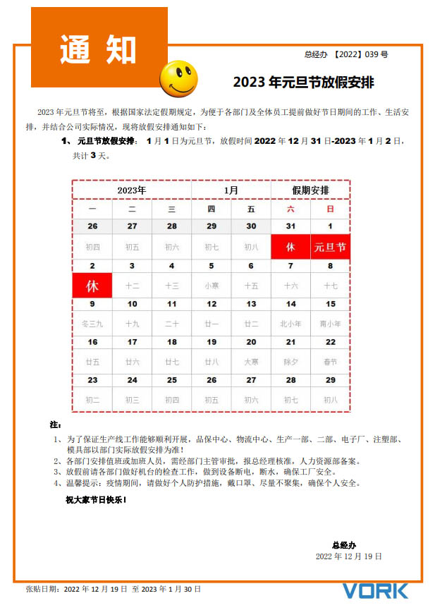 当社の具体的な状況に応じて、当社の春節休暇の手配は次のとおりです。
