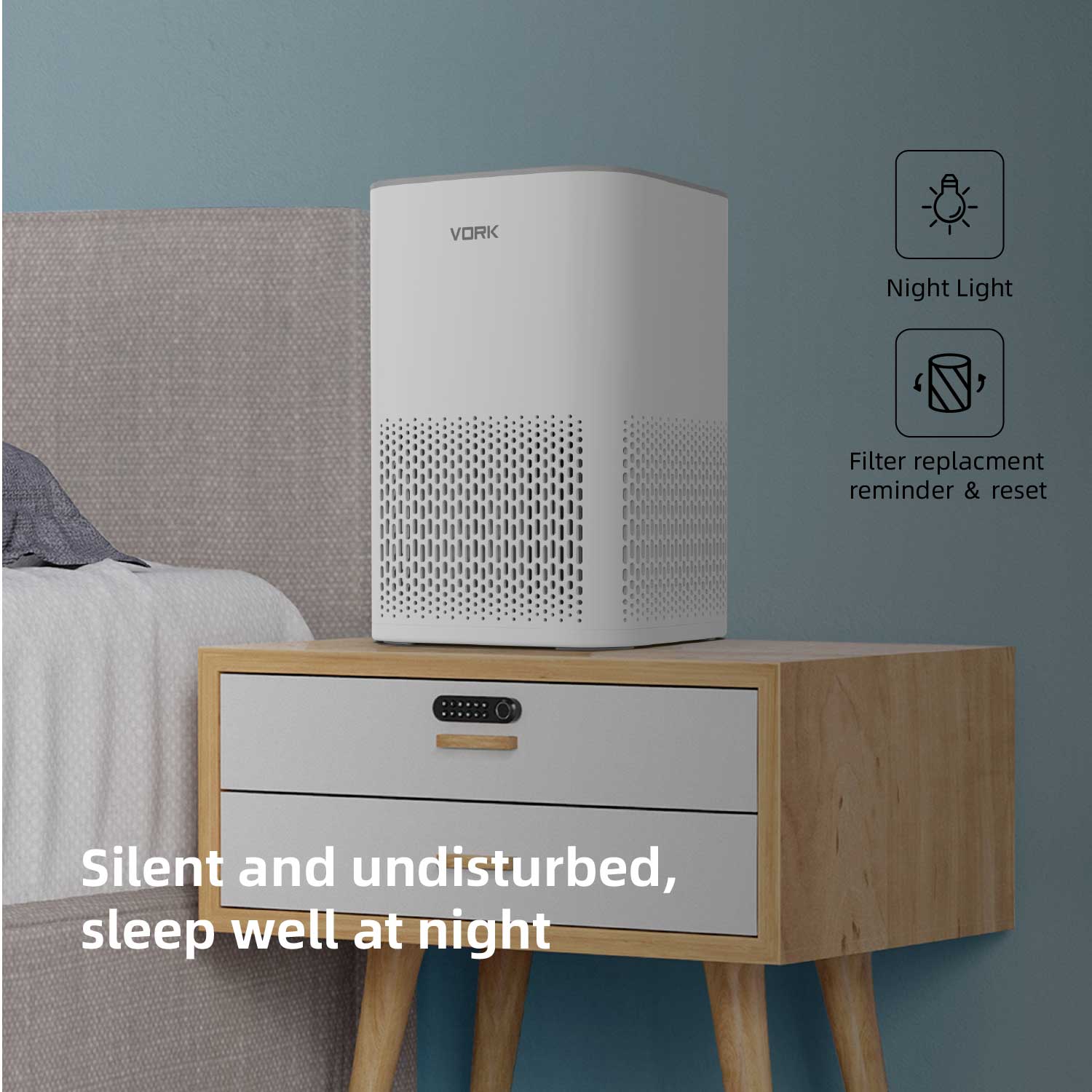 静かなスリープモード: 最小 騒音は23dBを超えません。 この空気清浄機は騒音が低く、静かで安らかな眠りを提供し、睡眠中に邪魔されることはありません。