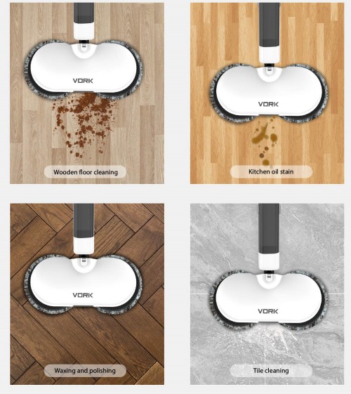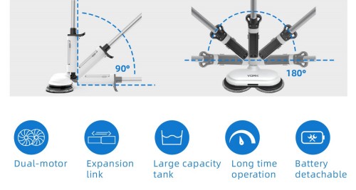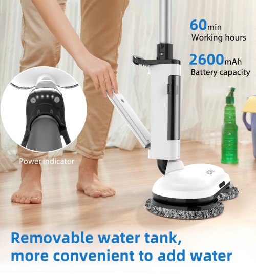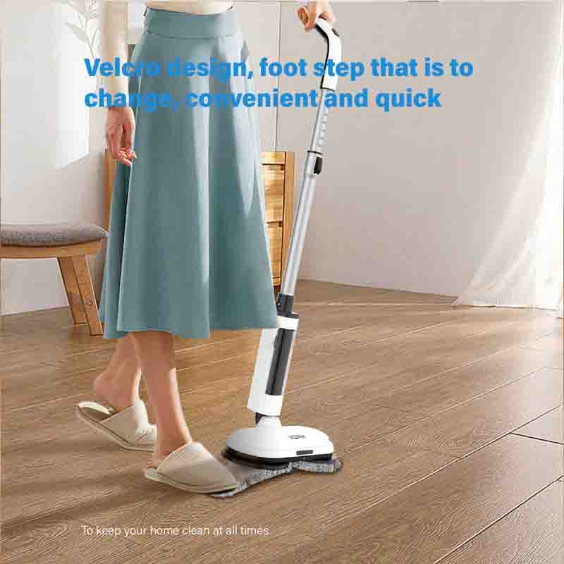 コードレス電動スピンモップには強力なデュアルロータリーモーターが装備されており、最大280r/minで走行可能、床の汚れを効果的に除去します。
